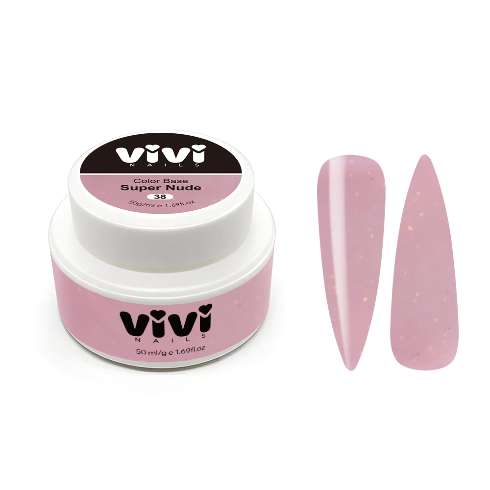 Cover base Super nude 38 con purpurina 50ml delicada y fina. Base rígida para nivelación  de textura media espesa, ideal para refuerzo de uñas naturales. Mantiene uñas impecables hasta 3-4 semanas sin desprendimientos ni grietas. El tono nude de muy buena pigmentación que cubre las imperfecciones de la uña natural. Sirve para las uñas normales, débiles o frágiles. Tiene bajo acidez Ph 6,5. Tiempo de secado rápido: 60 segundos en lámpara LED de 48W.