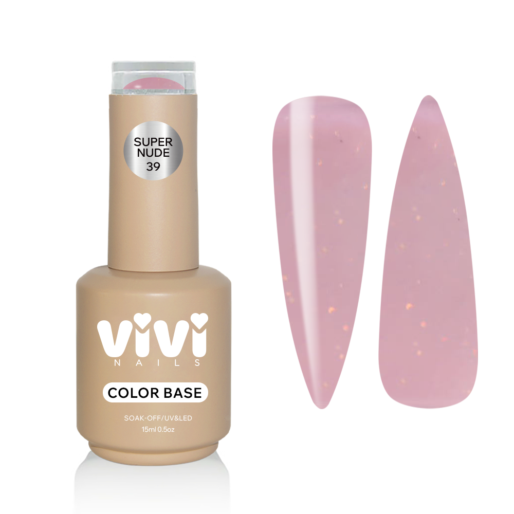Cover base Super nude 39 con purpurina de color arcoíris. Base rígida para nivelación de textura media espesa, ideal para refuerzo de uñas naturales. Mantiene uñas impecables hasta 3-4 semanas sin desprendimientos ni grietas. El tono nude de muy buena pigmentación que cubre las imperfecciones de la uña natural, color intenso. Sirve para las uñas normales , débiles o frágiles. Tiene bajo acidez Ph 6,5. Tamaño 15ml. Tiempo de secado rápido: 60 segundos en lámpara LED de 48W.