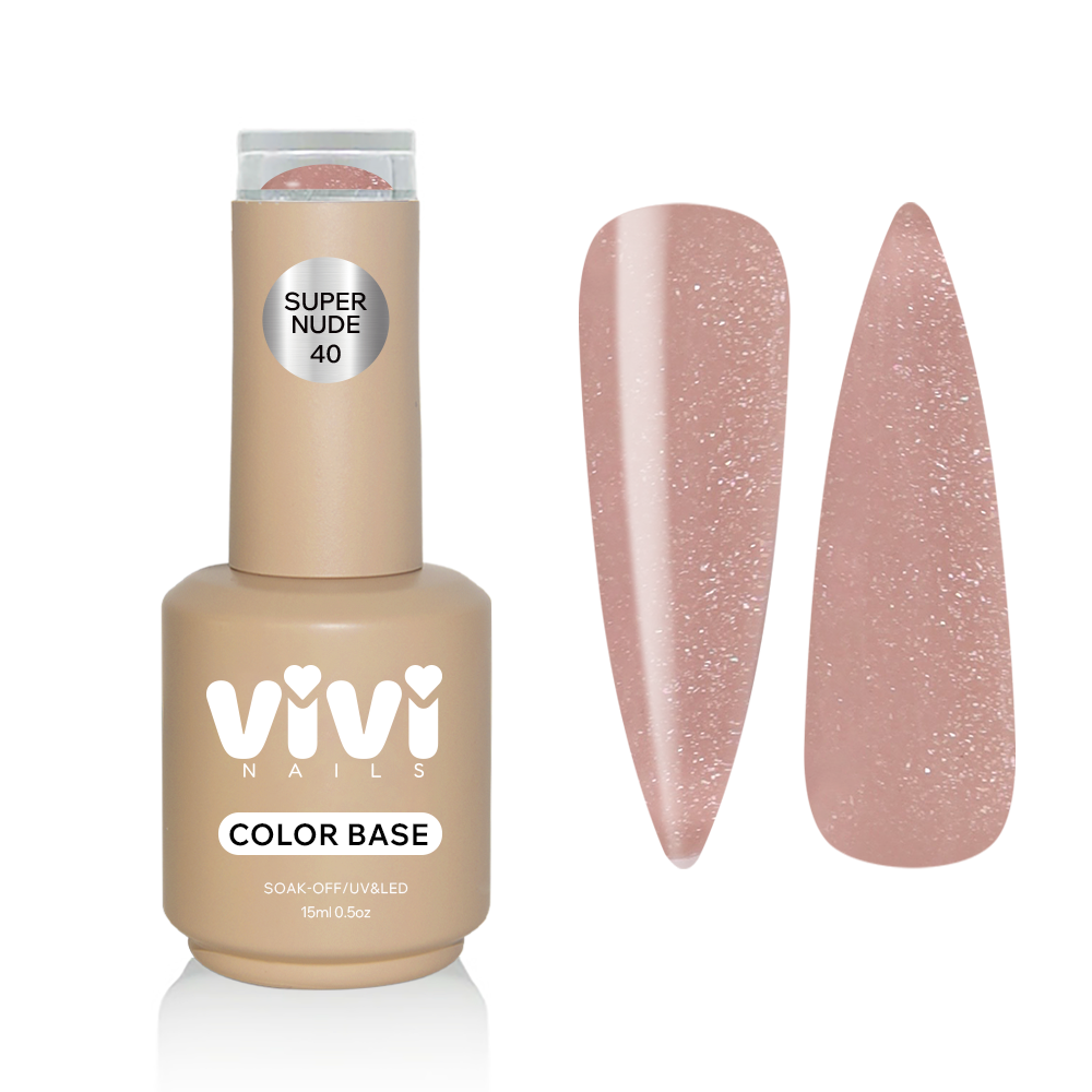 Cover base Super nude 40 con purpurina es Base rígida autonivelante de textura media espesa, ideal para refuerzo y nivelación de uñas naturales. Mantiene uñas impecables hasta 3-4 semanas sin desprendimientos ni grietas. El tono nude de muy buena pigmentación que cubre las imperfecciones de la uña natural, color intenso, perfecta para manicura francesa y looks elegantes. Sirve para las uñas normales , débiles o frágiles. Tiene bajo acidez Ph 6,5. Tamaño 15ml. Tiempo de secado rápido: 60 segundos en lámpara LED de 48W.