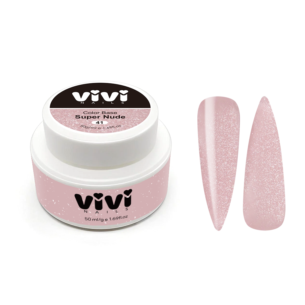 Cover base Super nude 41 con purpurina 50ml. delicada y fina. Base rígida para nivelación de textura media espesa, ideal para refuerzo de uñas naturales. Mantiene uñas impecables hasta 3-4 semanas sin desprendimientos ni grietas. El tono nude de muy buena pigmentación que cubre las imperfecciones de la uña natural. Sirve para las uñas normales, débiles o frágiles. Tiene bajo acidez Ph 6,5. Tiempo de secado rápido: 60 segundos en lámpara LED de 48W.
