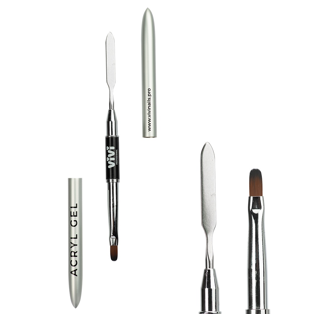 El Pincel Acryl gel con espatula 2 en 1 de Vivi Nails es la solución perfecta para trabajar con este tipo de materiales. Gracias a su diseño doble, reúne en un solo instrumento una espátula metálica para recoger y colocar el producto y un pincel fino y preciso de 10 x 4 mm para distribuirlo y moldearlo sobre la uña. Una herramienta profesional, versátil y cómoda que ahorra tiempo, mejora la precisión y permite resultados impecables en cada servicio.